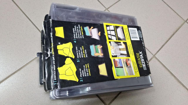 Органайзер Ezstax T-Shirt Organizing System позволит легко сложить футболки, кофты, рубашки, полотенца и прочую одежду. Ну а Вы получите аккуратную стопку красиво сложенных вещей и множество сэкономленного времени. Он очень прост и легок в использовании. Необходимо всего лишь положить каждую вещицу на отдельный поднос и поставить их один на второй, образуя этим стопку одежды. А для того, чтобы вытащить необходимую вещь, нужно приподнять верхнюю часть органайзера Ezstax и вытащить то, что искали. Вся остальная стопка, например, футболок, останется на своем месте, а не вывалится вместе с вытащенной футболкой.