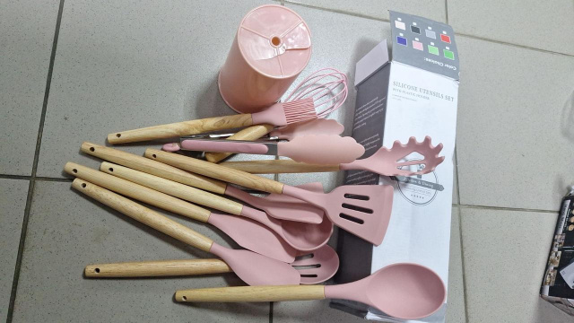 Набор кухонных принадлежностей состоит из 12 предметов. Сделан из силикона и бамбука, имеет антипригарное покрытие. Кухонный набор безопасен для использования с пищевыми продуктами. Он не имеет запаха. Выдерживает температуру до 230 градусов.