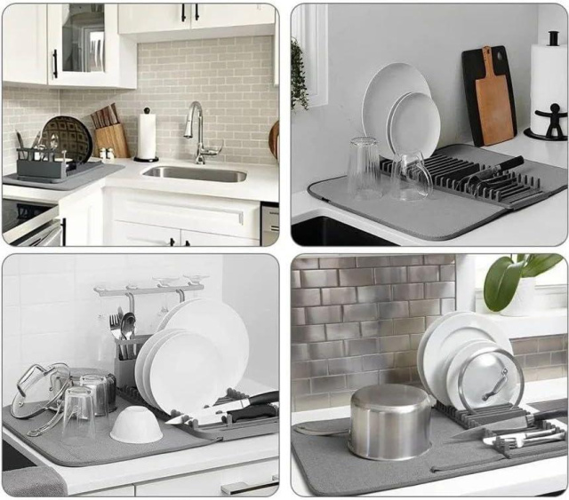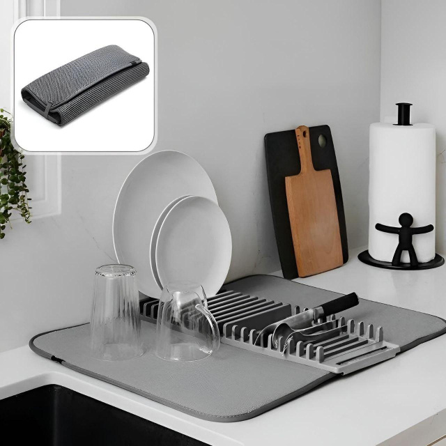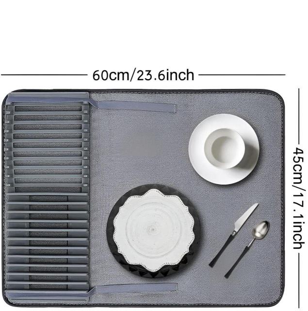 Изготовленна из качественного пластика и микрофибры. Сушилка подходит для разных типов посуды, включая тарелки, стаканы и столовые приборы. Конструкция подразумевает наличие специализированных отсеков для различных предметов, что обеспечивает надежность и удобство в использовании. Коврик, входящий в комплект, защитит столешницу от лишней влаги и обеспечит дополнительную устойчивость.