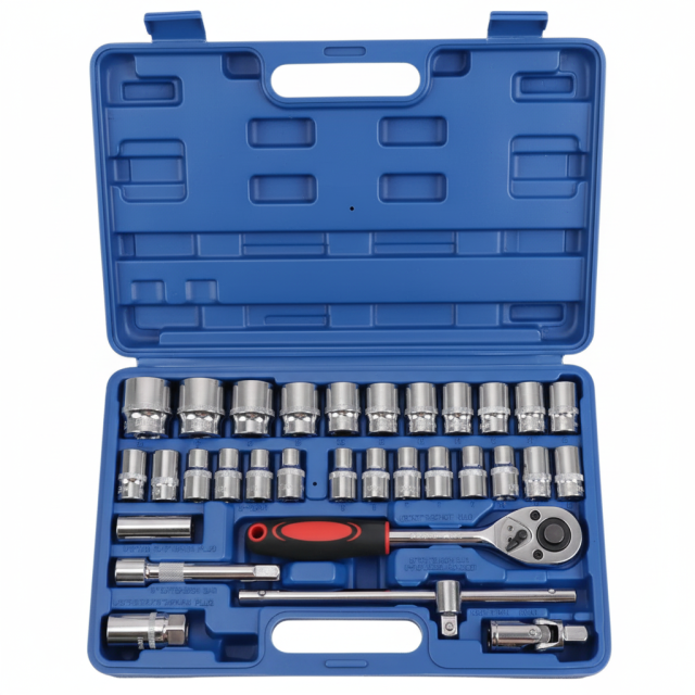 В комплекте — 32 предмета: торцевые и свечные головки, трещотка на 24 зубца, удлинители, карданный шарнир и т.д. Инструменты изготовлены из закаленной стали, устойчивой к коррозии. Эргономичная ручка трещотки обеспечивает комфорт, а магнит в свечных головках – надежную фиксацию.