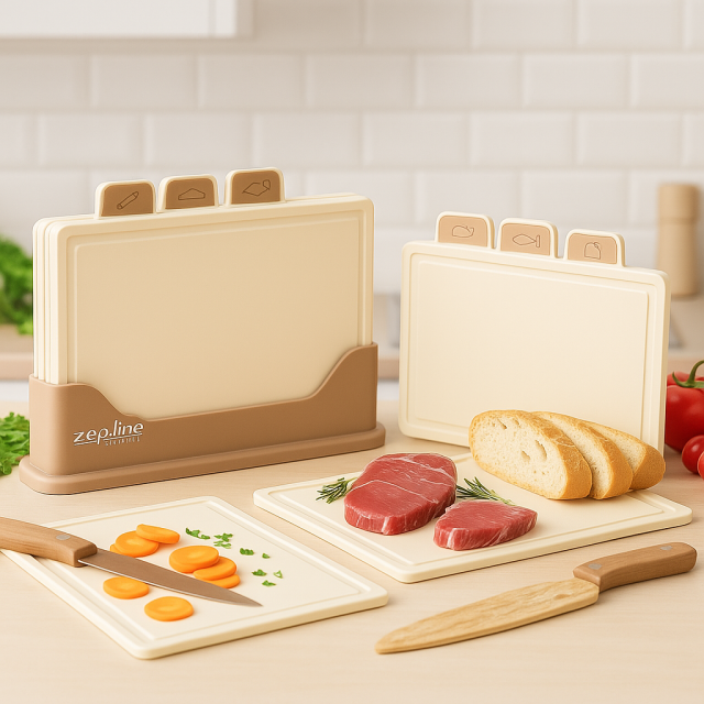 Доски изготовлены из высококачественного пищевого пластика, не впитывают запахи, устойчивы к влаге и царапинам. Каждая доска имеет двустороннюю рабочую поверхность и антискользящие элементы, что делает процесс нарезки максимально удобным и безопасным.